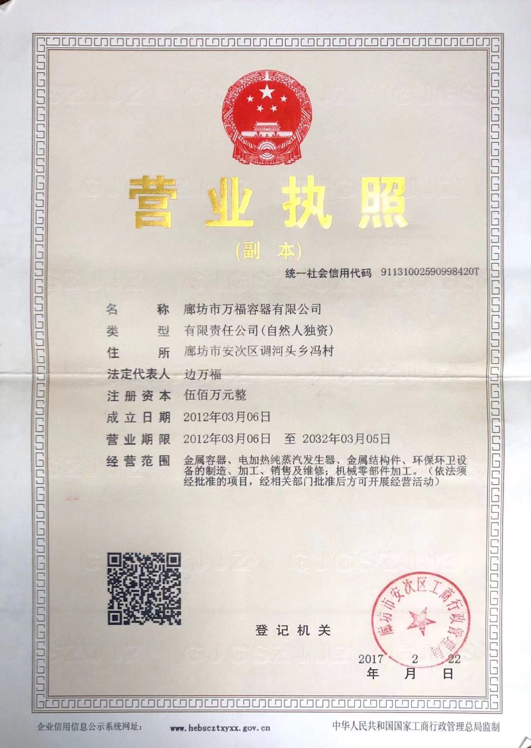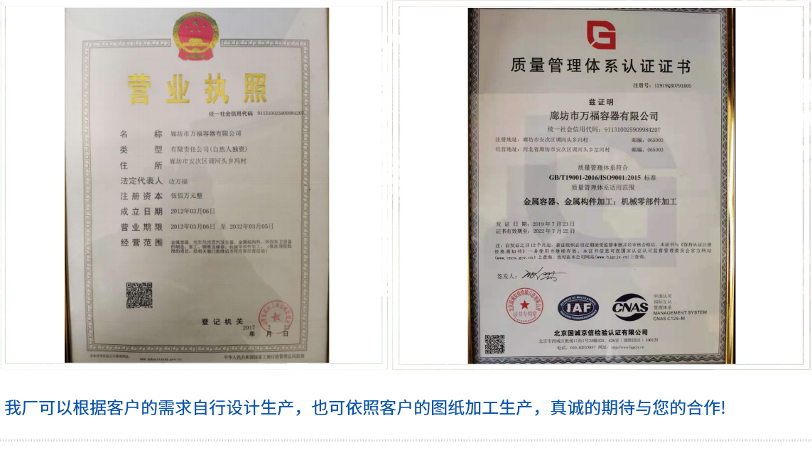 Specializing in the production of fluid containers 公司成立于2007年,位于素有"京津走廊、黄金地带"之称的河北省廊坊市,是一家专业从事流体容器生产及非标定制加工的公司多种规格,加工定制,检测完备